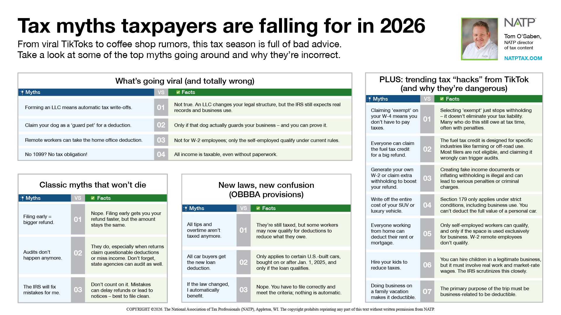 * The National Association of Tax Professionals (NATP) has prepared a “media backgrounder” outlining several common “Tax myths taxpayers are falling for in 2026”.